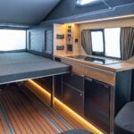 Całe DNA Wavecamper zostało wykorzystane również na popularnym podwoziu Renault Trafic, tworząc pojazd o wyjątkowej funkcjonalności i elastyczności aranżacji wnętrza. Kluczem są pojedyncze fotele montowane na systemie szynowym, które pozwalają na różnorodne konfiguracje – od 4-osobowego kampera z 4 miejscami do spania, po komfortowy transporter dla 6 osób. Po demontażu siedzeń lub łóżka powstaje przestrzeń idealna do przewozu większych przedmiotów.