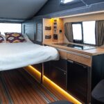 Siedzenia w pierwszym rzędzie zwrócone w kierunku jazdy. Dolne łóżko rozłożone. Fotele w drugim rzędzie można schować jeden za drugim pod łóżkiem, co pozwala na przechowywanie długich przedmiotów i jednoczesny nocleg dla 4 osób.