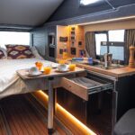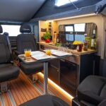 Siedzenia w pierwszym rzędzie zwrócone ku przestrzeni mieszkalnej. Dolne łóżko rozłożone. Siedzenia w drugim rzędzie można schować obok siebie pod łóżkiem, co ułatwia dostęp do szafek w części dziennej. Konsola rozszerzona. Wolny przedział bagażowy.