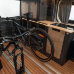 Siedzenia w pierwszym i drugim rzędzie zwrócone w kierunku jazdy. Zdemontowane dolne łóżko. Jeden rower w szynie po lewej stronie, drugi rower w szynie po prawej stronie.
