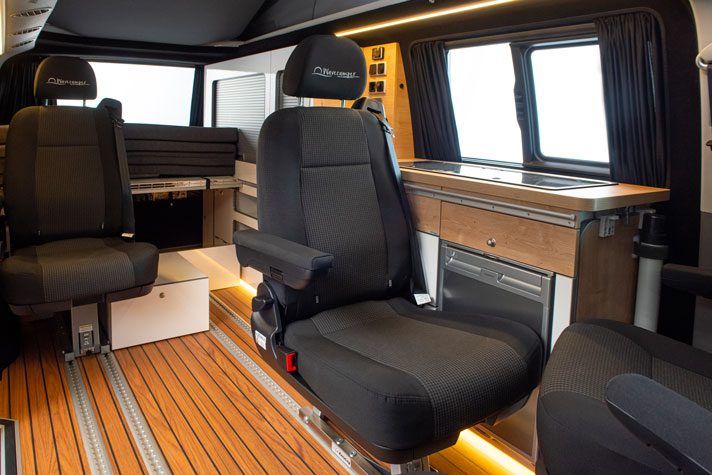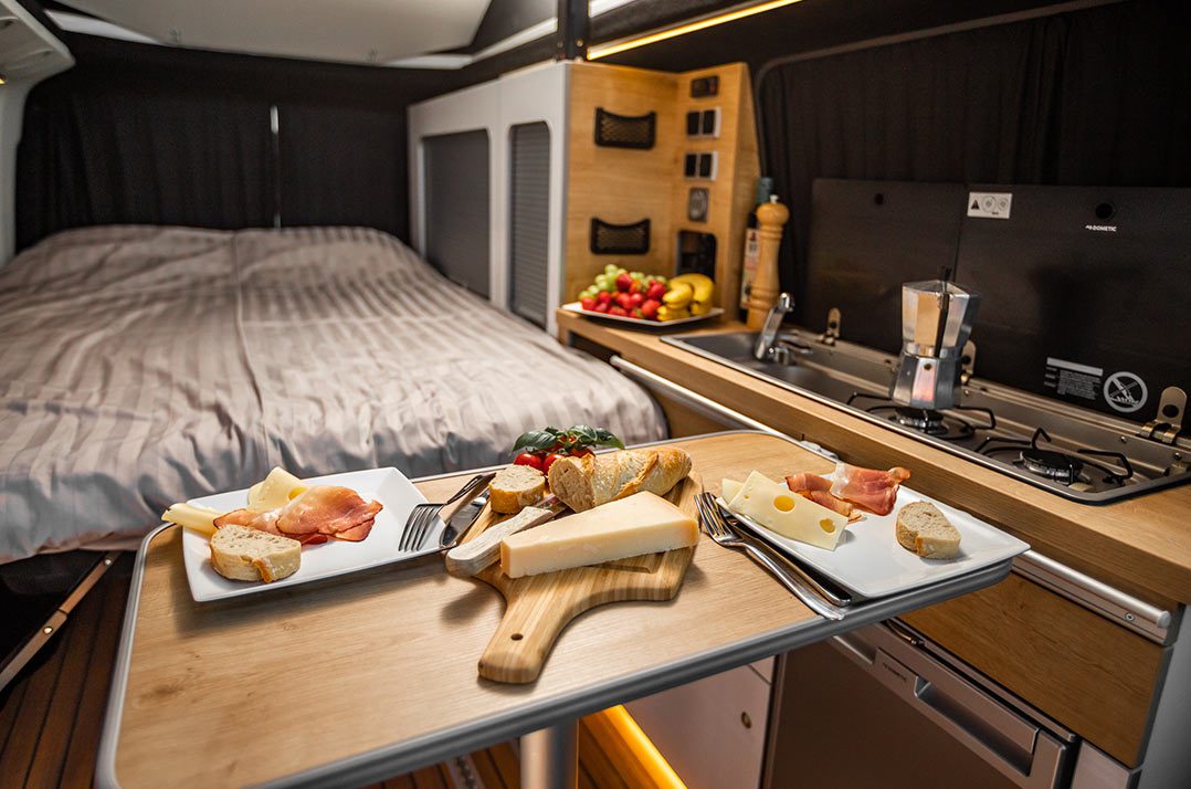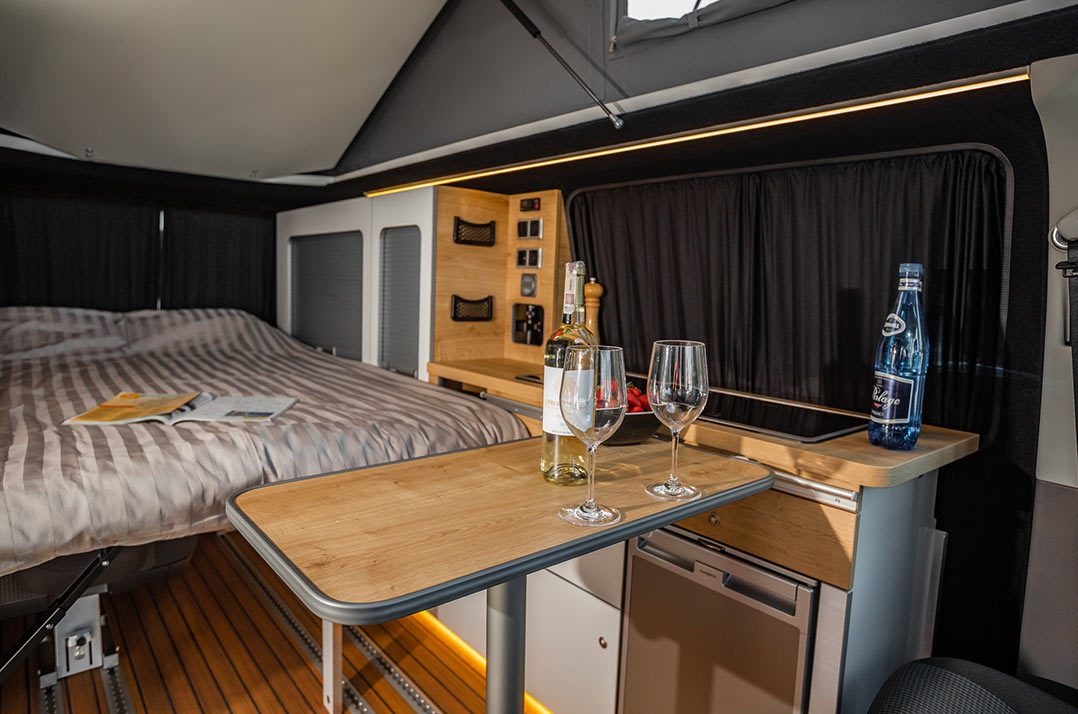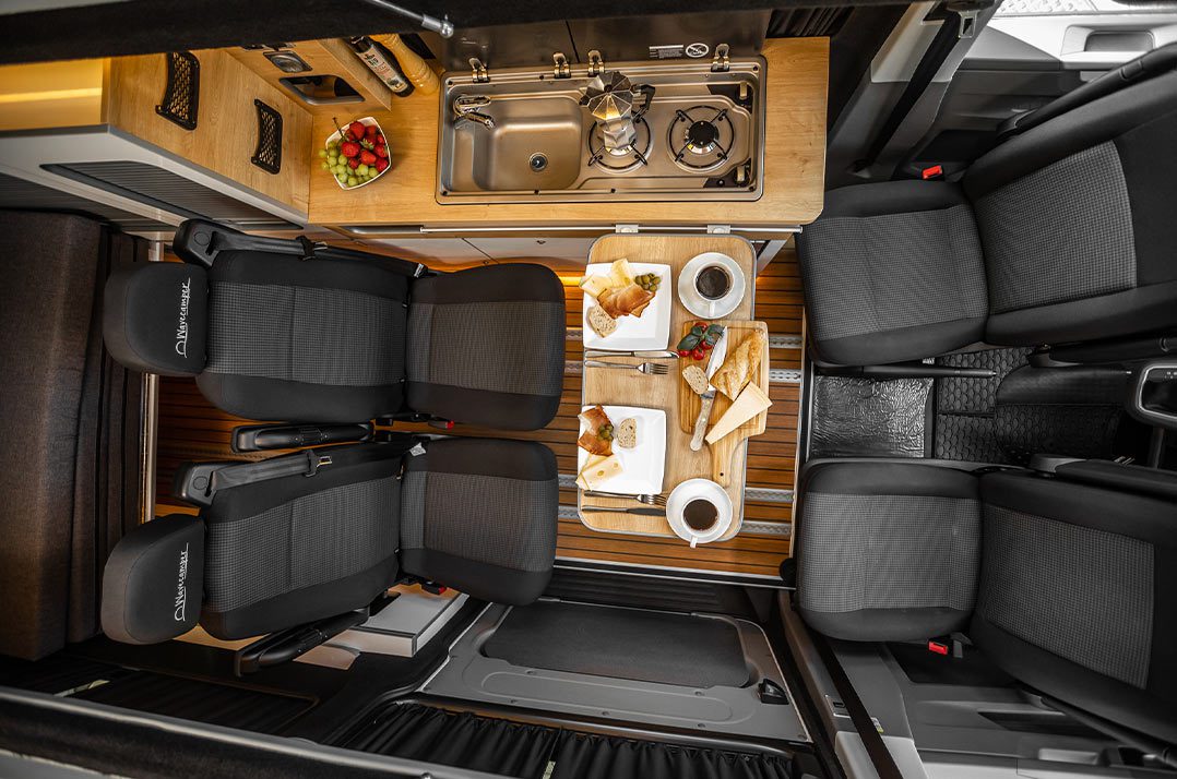 WAVECAMPER to przede wszystkim funkcjonalne wnętrze, w którym możesz spędzać czas z rodziną i znajomymi. Obrotowe fotele z przodu oraz możliwość wykorzystania poszczególnych siedzeń w układzie naprzemiennym pozwalają uzyskać iście „salonowy” klimat. Rozkładany stół oferuje miejsce na przytulne spotkania, a jednocześnie obok można stworzyć wygodny kącik do czytania. Odpowiednia konfiguracja foteli pozwala delektować się lampką wina nawet w większym gronie. Możliwe jest nawet połączenie sypialni i salonu w tym samym czasie.