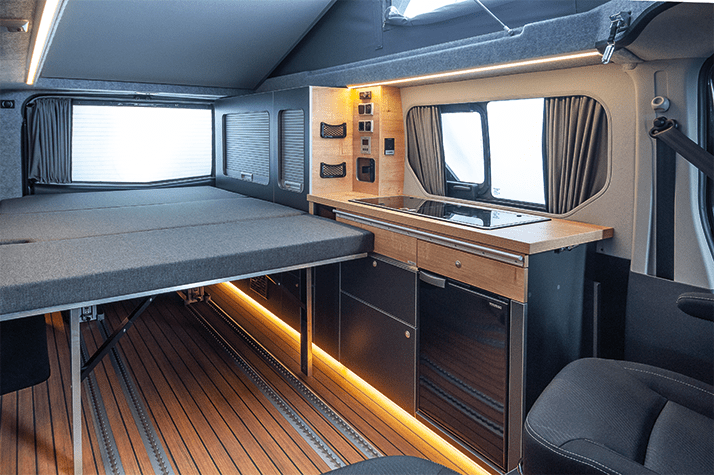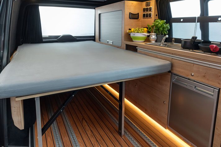Podwójne łóżko w podnoszonym dachu sypialnym oferuje dużo miejsca dla dwojga dorosłych osób. Korzystanie z łóżka w dachu nie zaburza funkcjonalnie przestrzeni mieszkalnej na dole. Chcąc rozłożyć dolne łóżko po prostu przesuwamy fotele lub chowamy je pod łóżkiem. Podróżujące pary korzystające z łóżka w podnoszonym dachu mogą rozważyć całkowity dedmontaż dolnego łóżka. Wavecamper staje się wówczas wakacyjnym mini apartamentem z funkcjonalnie wydzielonymi strefami. O nastrojowe oświetlenie zadbają wysokiej jakości lampy LED. W każdej chwili mamy łatwy dostęp do szafek i wyposażenia – składanego stolika, blatu roboczego czy schowków.