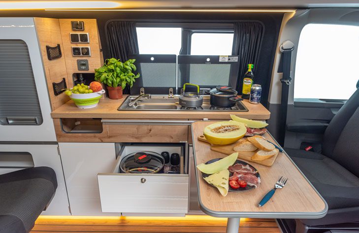 Dwupalnikowa kuchenka gazowa, lodówka z zamrażalnikiem i funkcjonalna powierzchnia robocza zapewniają odpowiednie warunki do przygotowania pysznych posiłków. Zintegrowany moduł kuchenny oferuje również wystarczająco dużo miejsca na wyposażenie, które można bezpiecznie przechowywać w przestronnych szafkach. Posiłek dla czterech osób? Duży dodatkowy stół oferuje miejsce dla całej rodziny. Aby przygotować szybkie śniadanie wykorzystać można rozkładany stolik, który jednocześnie oferuje dodatkową powierzchnię roboczą podczas gotowania. Podobnie jako blaty robocze wykorzystać można przestrzeń na pokrywach kuchenki i zlewozmywaka.