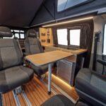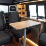 Siedzenia w pierwszym rzędzie skierowane w kierunku jazdy. Siedzenia w drugim rzędzie (obok siebie) zwrócone w stronę części mieszkalnej. Siedzenia w trzecim rzędzie zwrócone w kierunku jazdy. Dolne łóżko złożone.