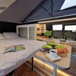 Siedzenia w pierwszym rzędzie z widokiem na część mieszkalną. Dolne łóżko rozłożone. Siedzenia w drugim rzędzie można schować obok siebie pod łóżkiem, co ułatwia dostęp do szafek z części dziennej. Konsola rozszerzona. Wolny przedział bagażowy.