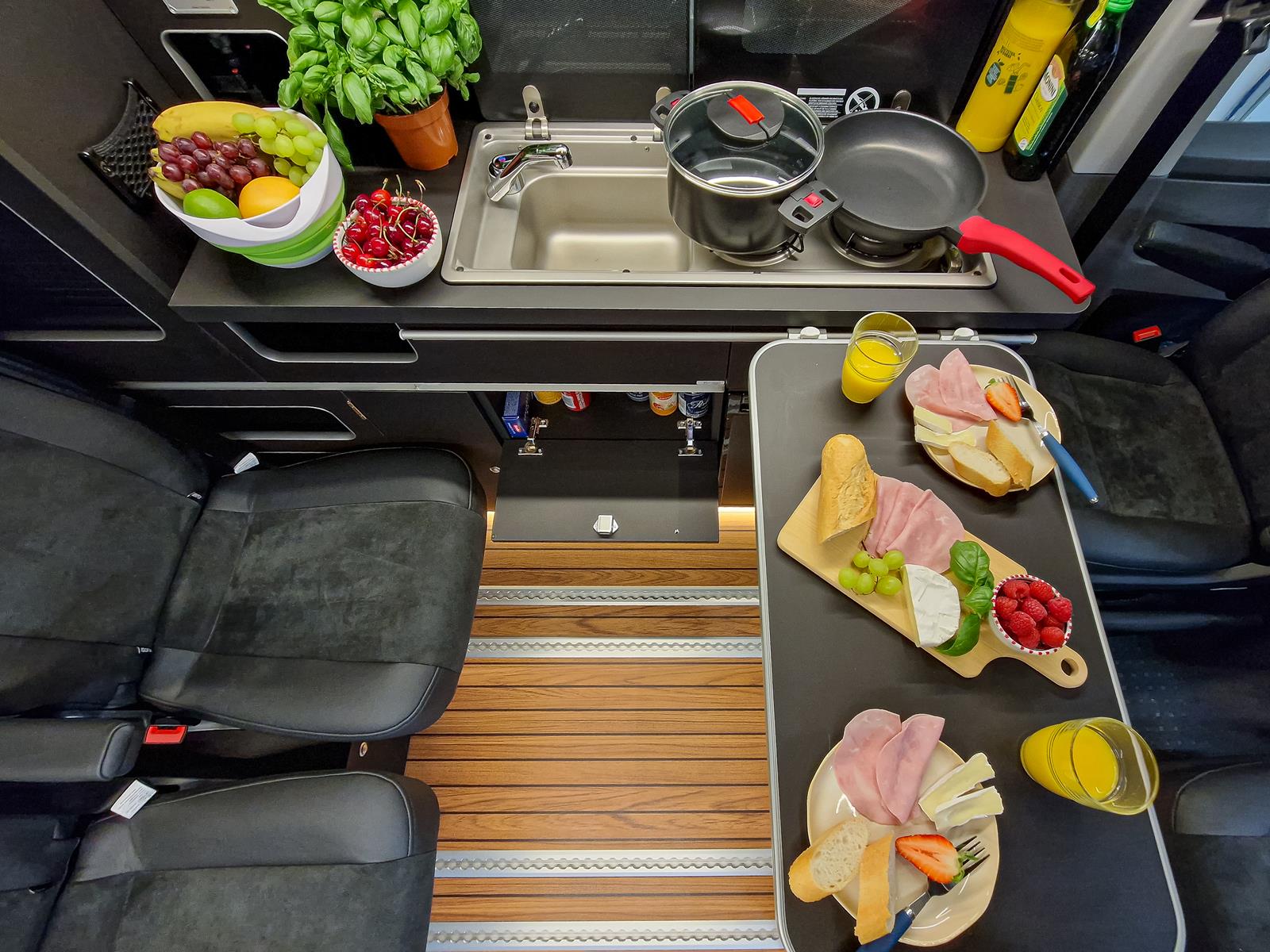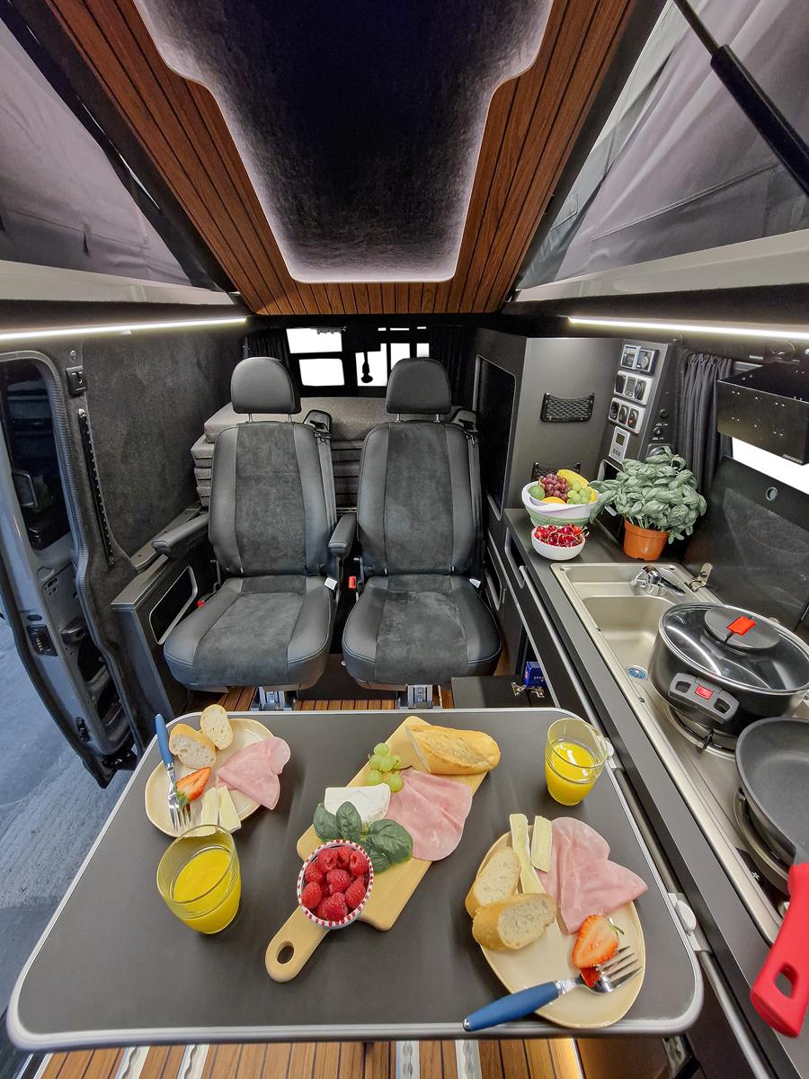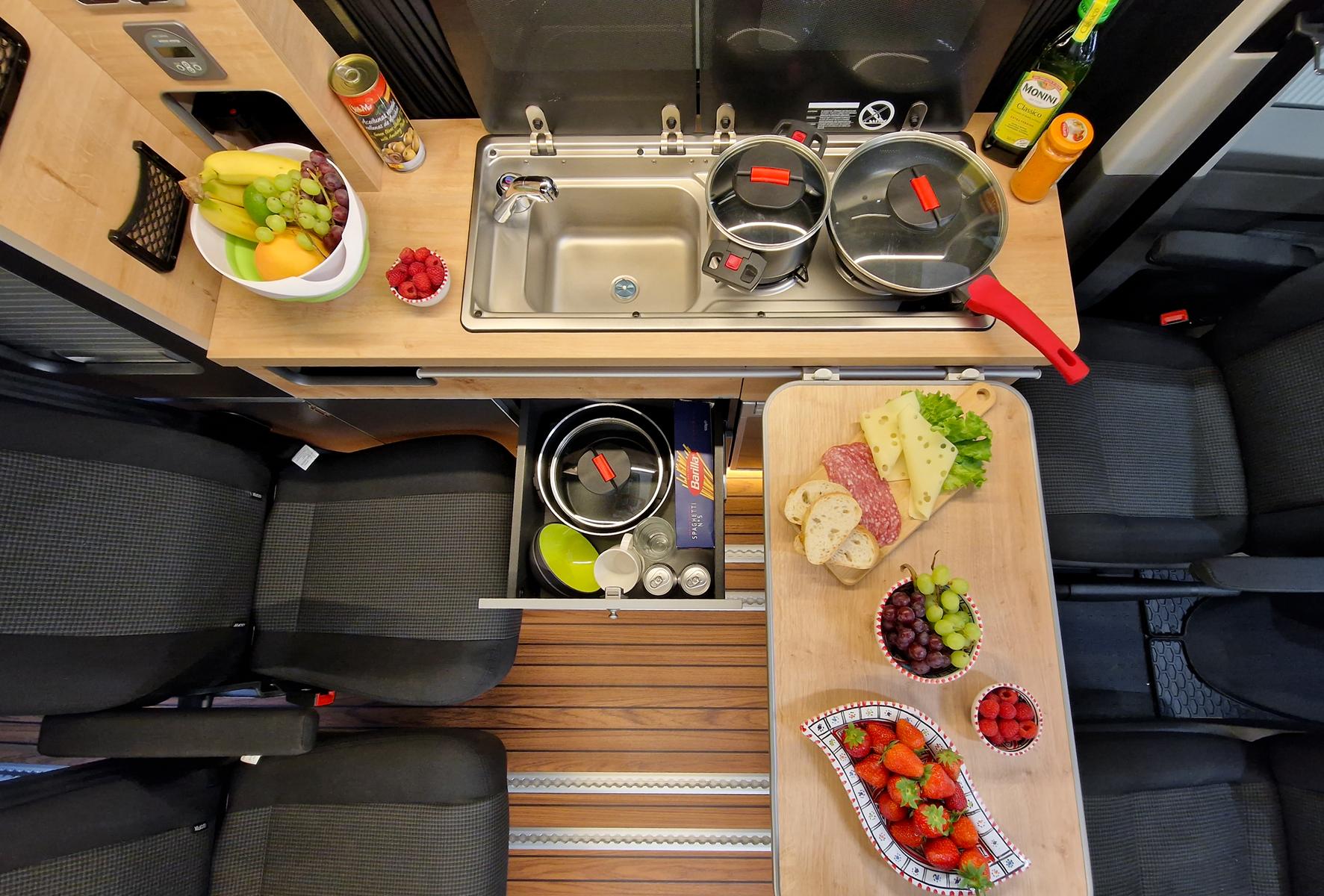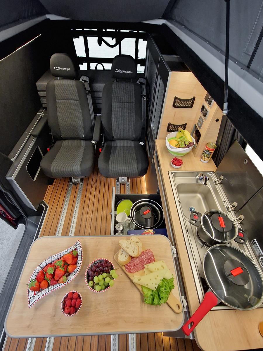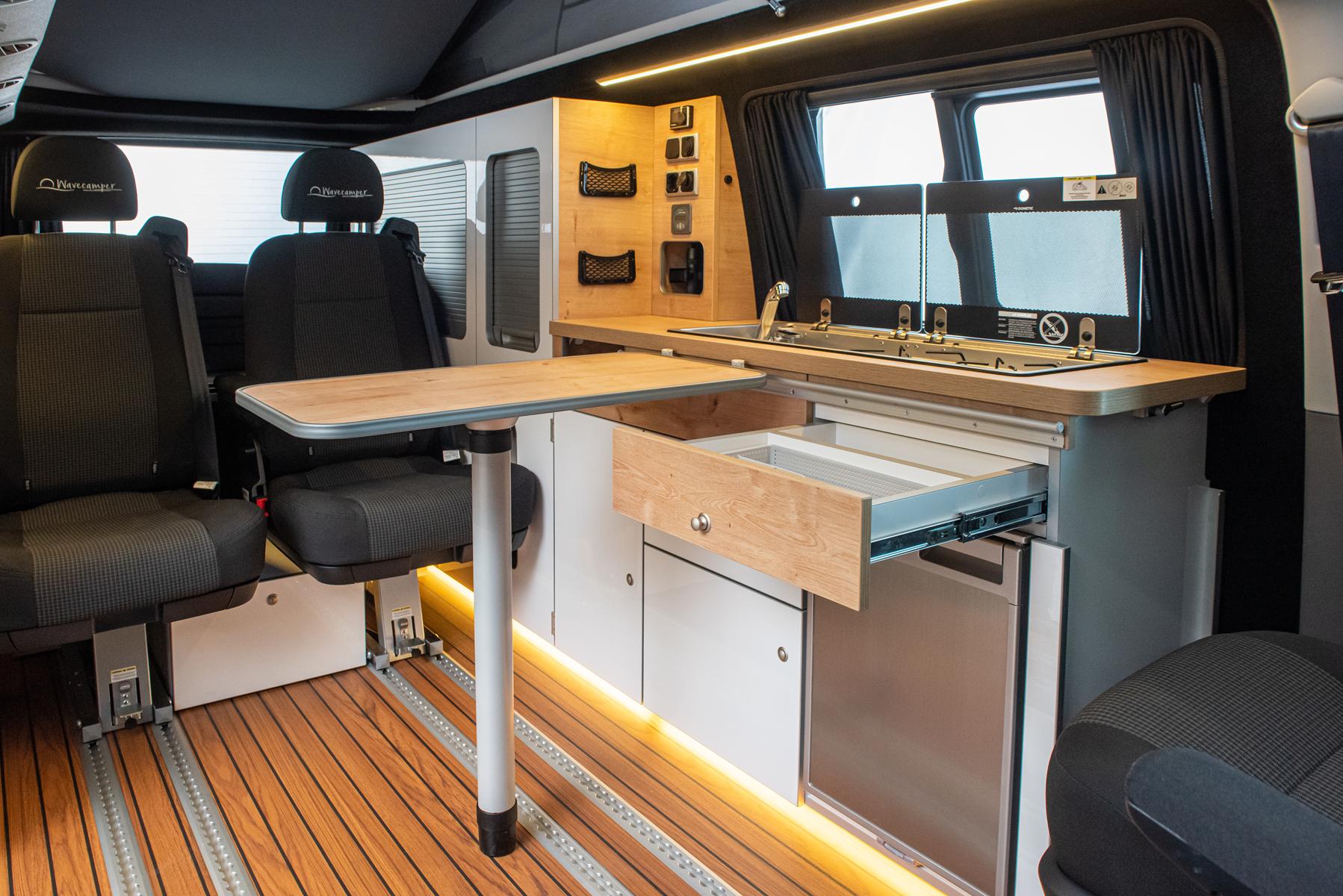 Wyposażenie zabudowy obejmuje wysokiej klasy lodówkę kompresorową firmy Dometic, rozbudowaną instalację elektryczną z dodatkowym akumulatorem, kompletną izolację z eleganckim tapicerskim wykończeniem wnętrza oraz praktyczny zlewozmywak ze szklaną pokrywą i składanym, zintegrowanym kranem. Dodatkowo oferujemy składany stolik za siedzeniem kierowcy, który można wygodnie używać również poza pojazdem, a także wiele innych udogodnień. Ważnym atutem jest kompletna zabudowa meblowa wykonana z lekkiej sklejki, pokrytej odpornym na uszkodzenia laminatem CPL, gwarantująca trwałość i estetykę nawet podczas intensywnego użytkowania.