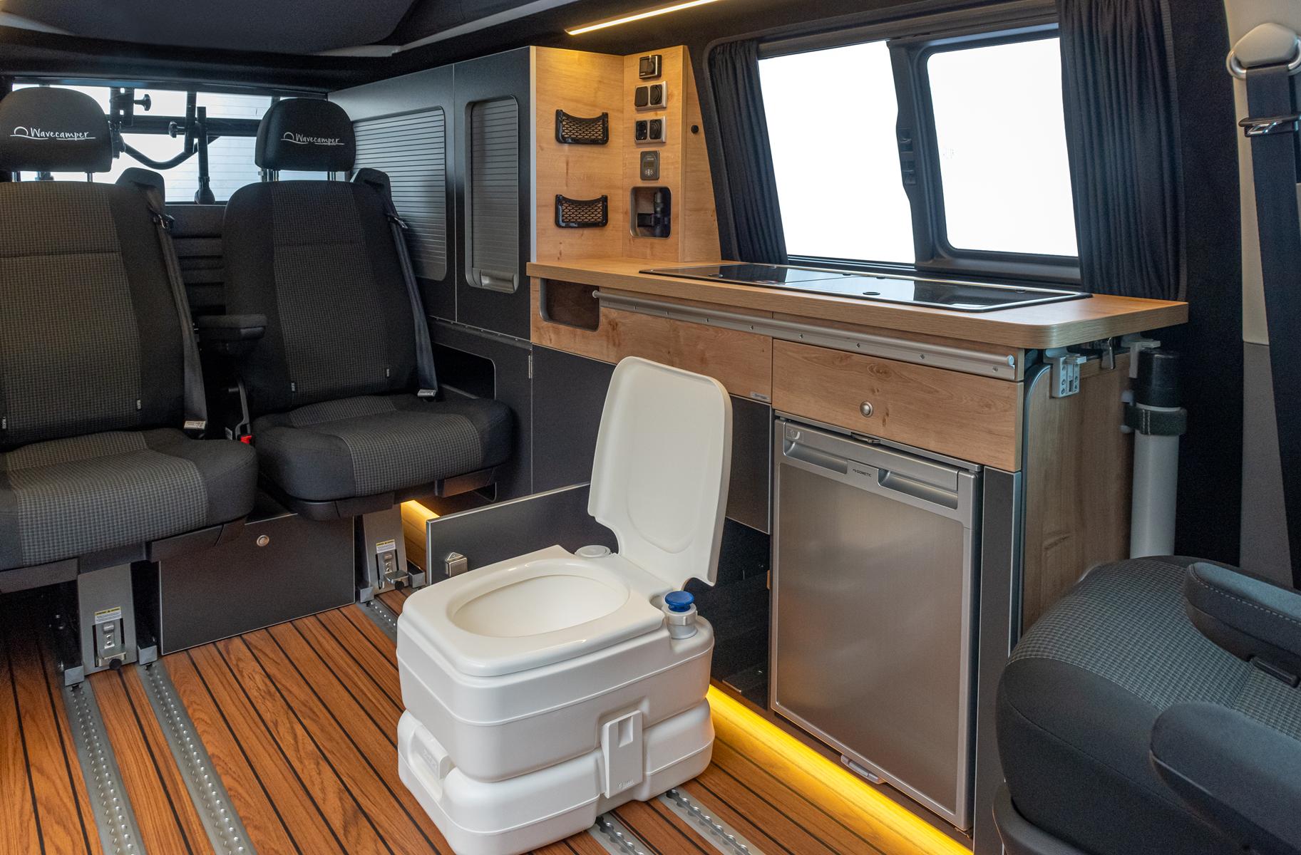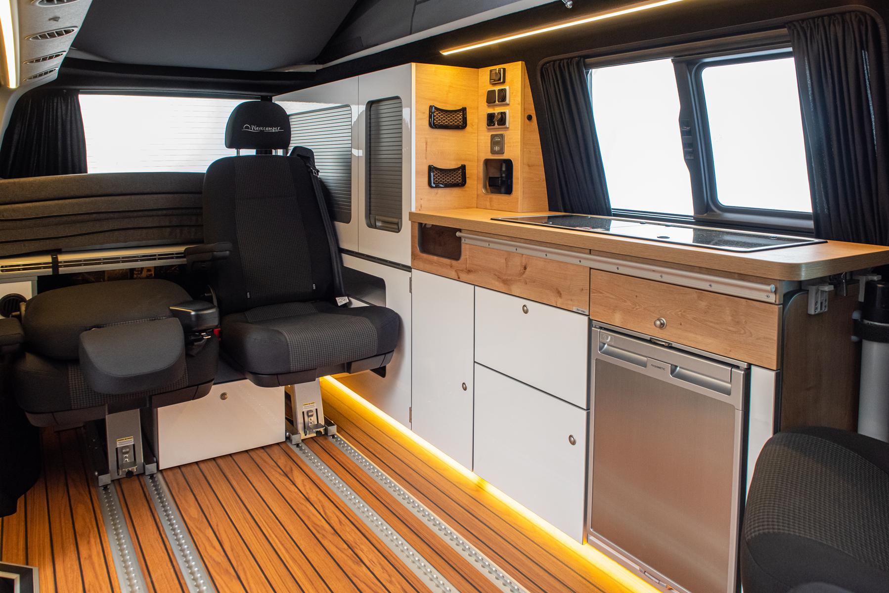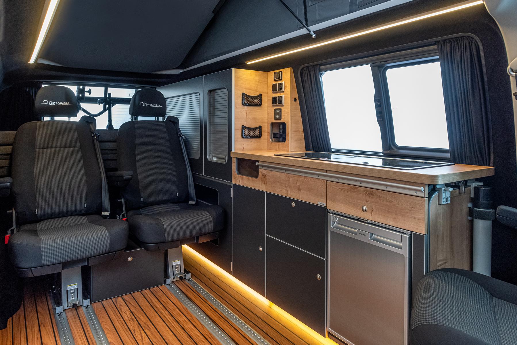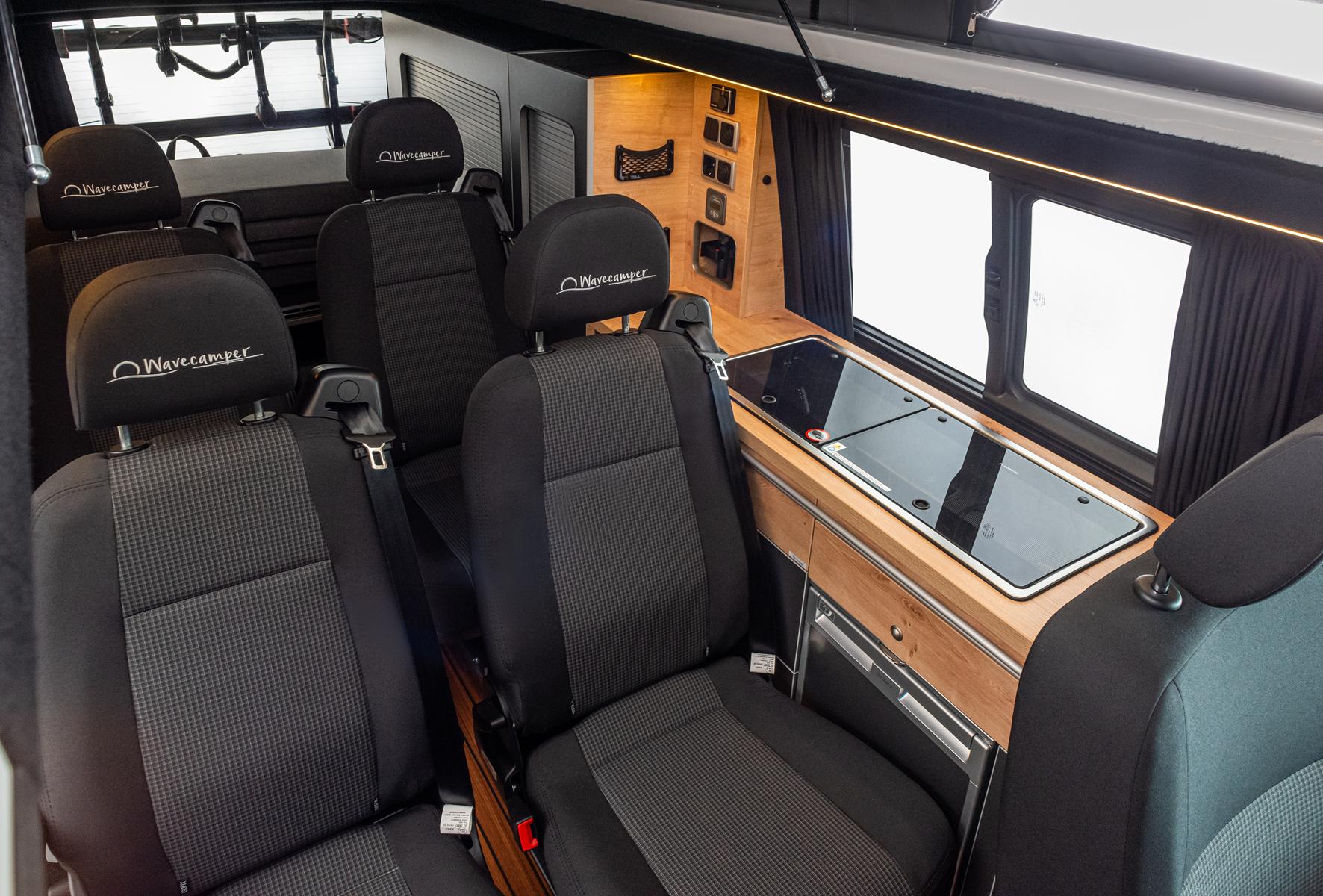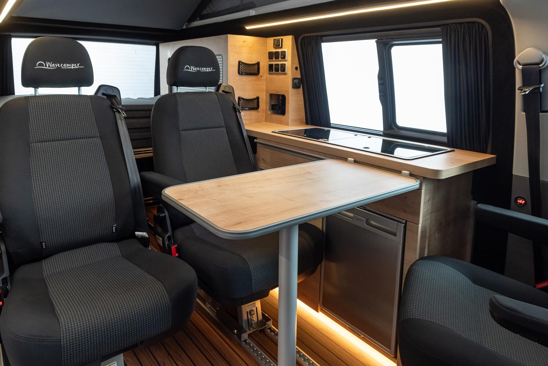 Zabudowa Wavecamper na Volkswagenie T6.1 wyróżnia się ponadprzeciętną funkcjonalnością i elastycznością aranżacji wnętrza. Kluczowym elementem są pojedyncze fotele montowane na systemie szynowym, które można dowolnie przesuwać, dokładać lub całkowicie demontować. Dzięki temu pojazd może pełnić rolę 4-osobowego kampera z 4 miejscami do spania lub komfortowego transportera dla 6 osób. Dostępne modele bazujące na wersji SHORT oraz LONG.