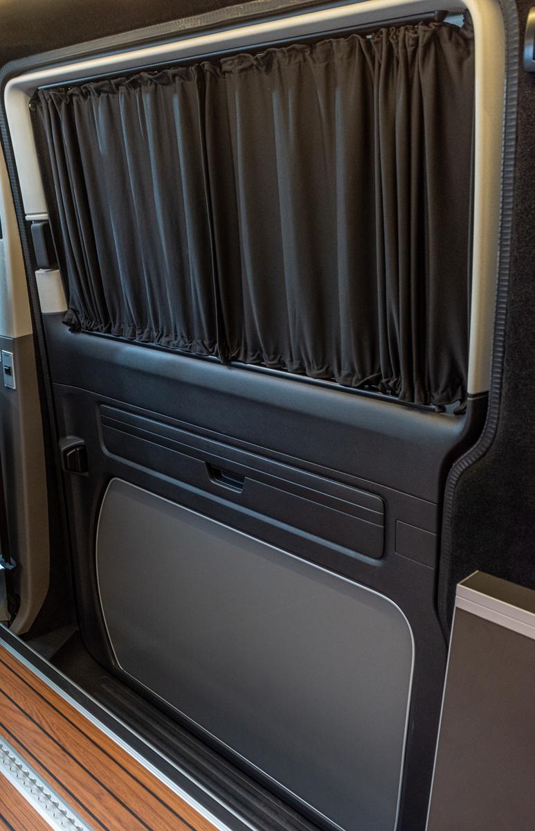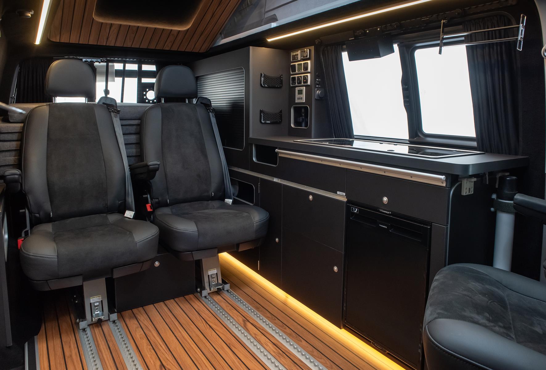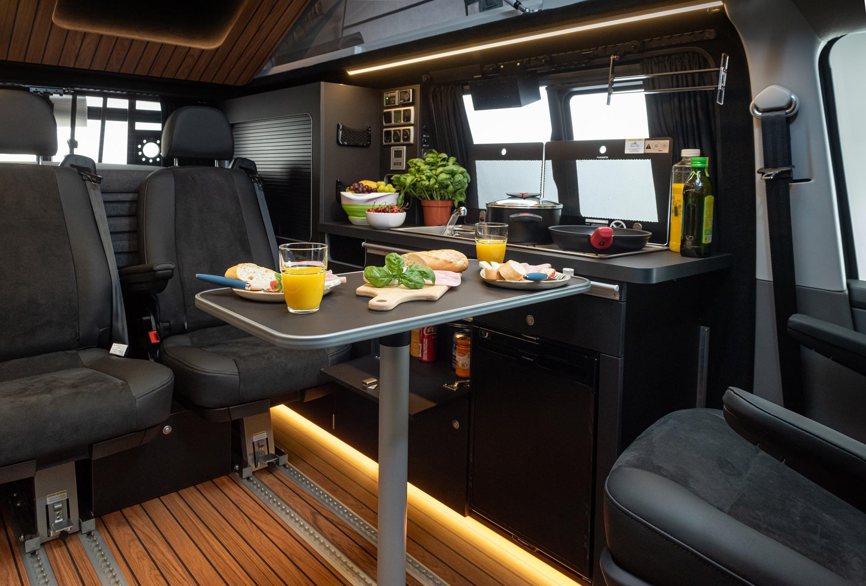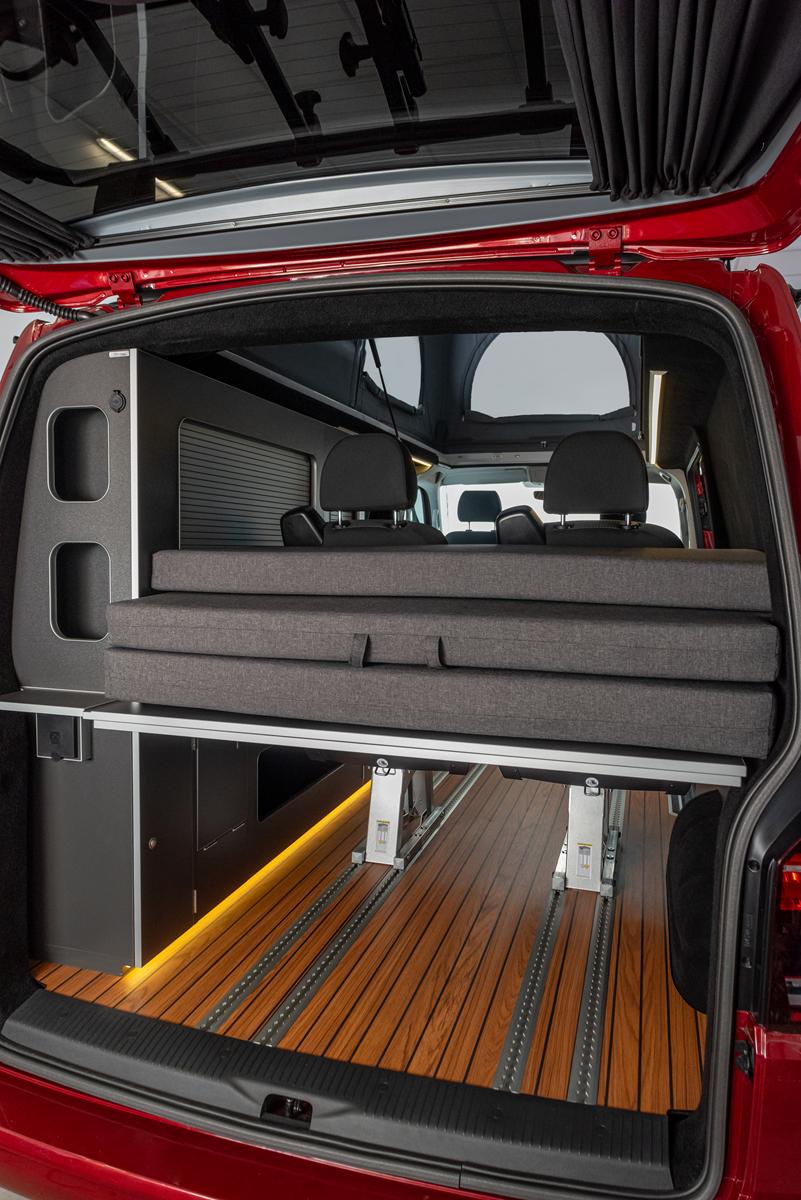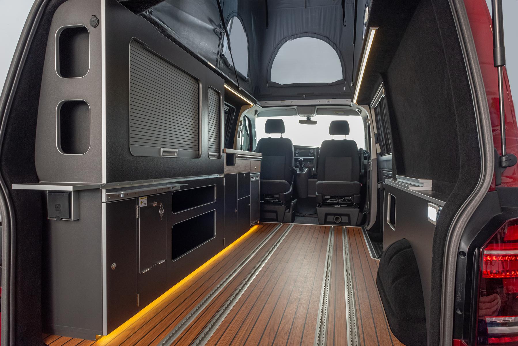 Zabudowa Wavecamper na Volkswagenie T6.1 wyróżnia się ponadprzeciętną funkcjonalnością i elastycznością aranżacji wnętrza. Kluczowym elementem są pojedyncze fotele montowane na systemie szynowym, które można dowolnie przesuwać, dokładać lub całkowicie demontować. Dzięki temu pojazd może pełnić rolę 4-osobowego kampera z 4 miejscami do spania lub komfortowego transportera dla 6 osób. Dostępne modele bazujące na wersji SHORT oraz LONG.
